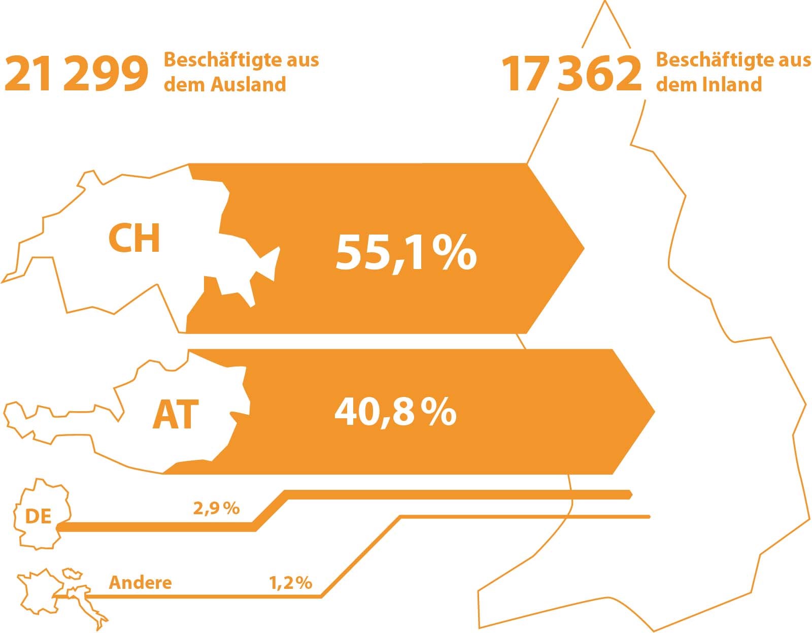 Erstklassige Jobs machen die Arbeit in der Industrie, in der Finanzbranche oder im Gewerbe in Liechtenstein überaus attraktiv. Nicht ganz die Hälfte der Arbeitsplätze vermag Liechtenstein mit seiner eigenen erwerbstätigen Wohnbevölkerung zu besetzen. Die andere Hälfte wird von sogenannten Grenzgängern eingenommen, die als Zupendler täglich aus den benachbarten St. Galler Rheintal, aus Vorarlberg und der näheren Bodenseeregion zur Arbeit nach Liechtenstein fahren.