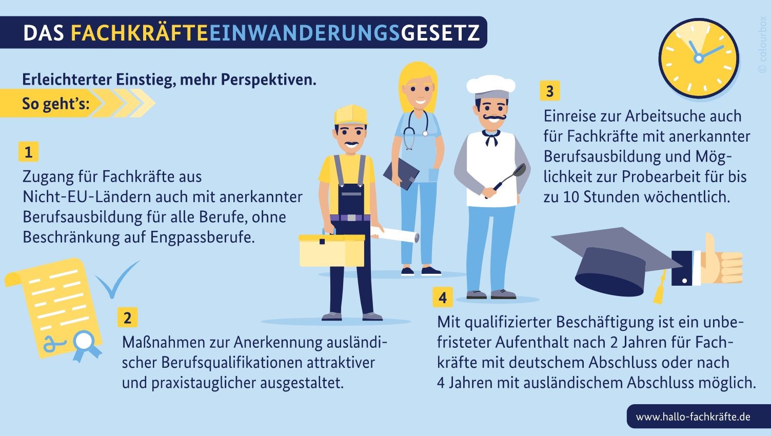 Deutschland hat vor einigen Jahren das Internetportal „Make it in Germany“ eingerichtet. Dort werden Interessenten auf Englisch, Französisch, Spanisch sowie in elf weiteren Sprachen über Arbeits- und Ausbildungsmöglichkeiten in Deutschland informiert. Natürlich erfährt man dort auch alles darüber, was sich durch das neue Gesetz ändert und wen es betrifft.