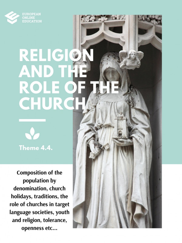 Composition of the population by denomination, church holidays, traditions, the role of churches in target language societies, youth and religion, tolerance, openness etc...