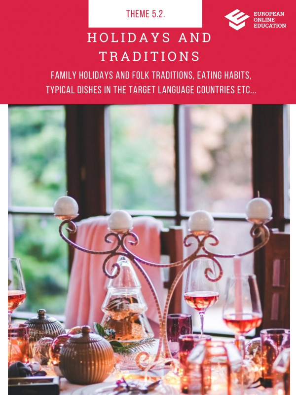 Family holidays and folk traditions, eating habits, typical dishes in the target language countries etc...